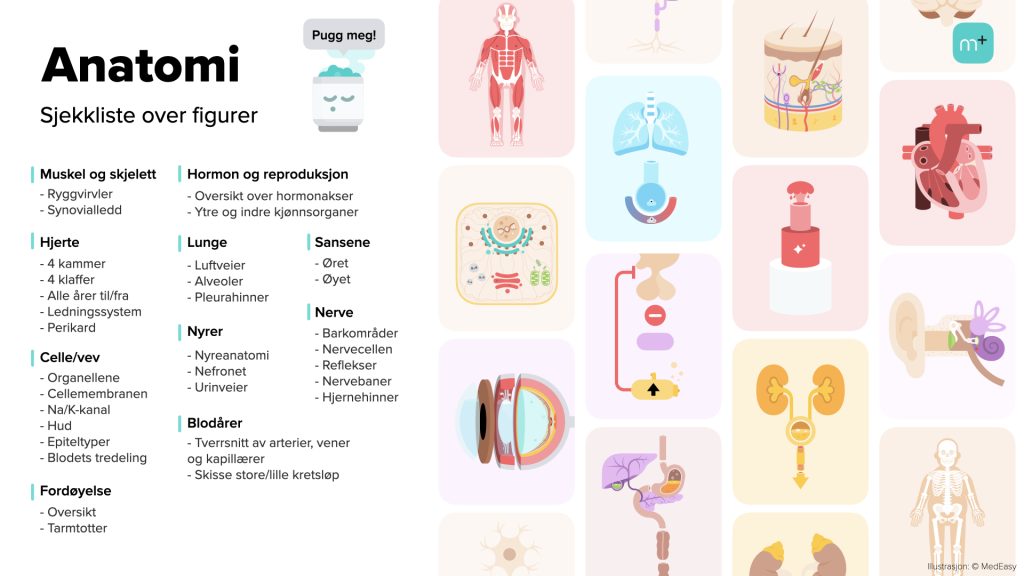Vil du øve deg på å sette navn på figurer, så finner du anatomispillet på MedEasys nettsider! Og du kan jo så klart alltid repetere sammen med oss i videoene våre.