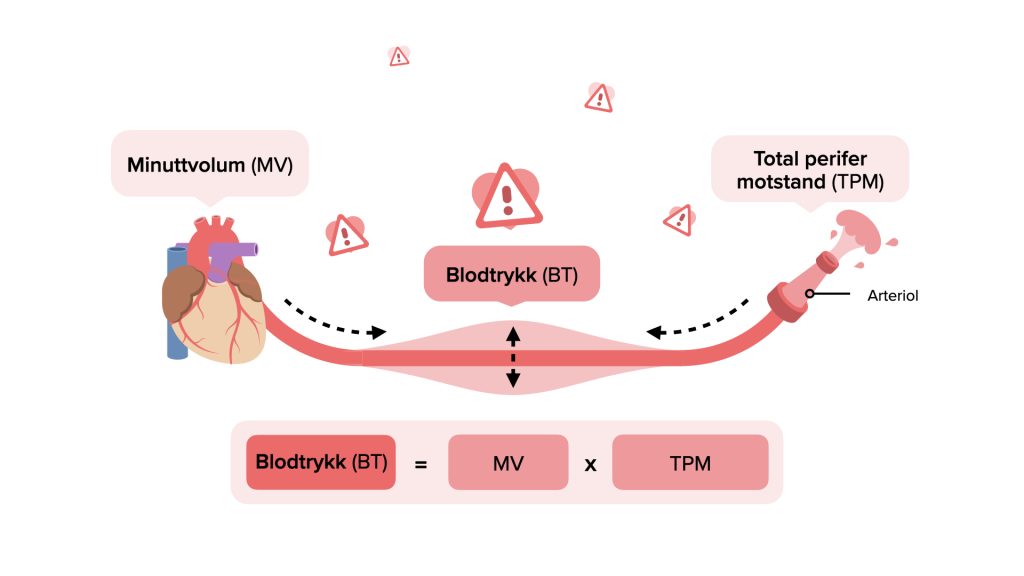 Du må forstå blodtrykksformelen grundig og skille mellom mekanismer for korttids- og langtidsregulering av blodtrykk. Korttidsregulering skjer via baroreseptorer og det autonome nervesystemet, og langtidsregulering via RAAS og ADH. Du må også kunne forklare hvordan minuttvolum og total perifer motstand påvirker blodtrykket.
