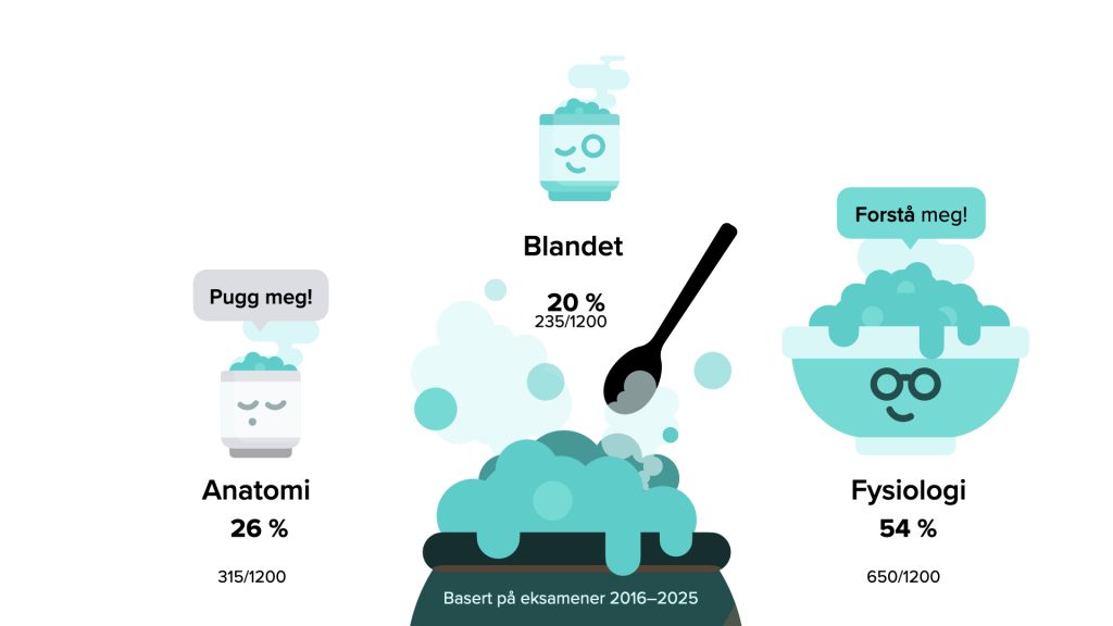 En tydelig trend på eksamen er mer sammensatte oppgaver som tester fysiologiforståelse. I tillegg kommer det nesten alltid noe fra hvert tema, så du testes bredt, og får mulighet til å vise kunnskap på mange ulike områder.